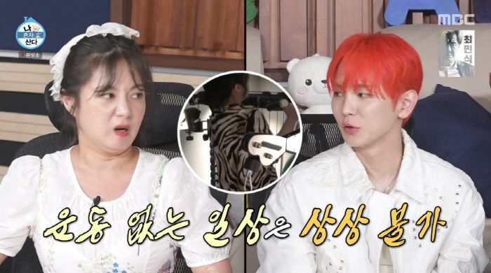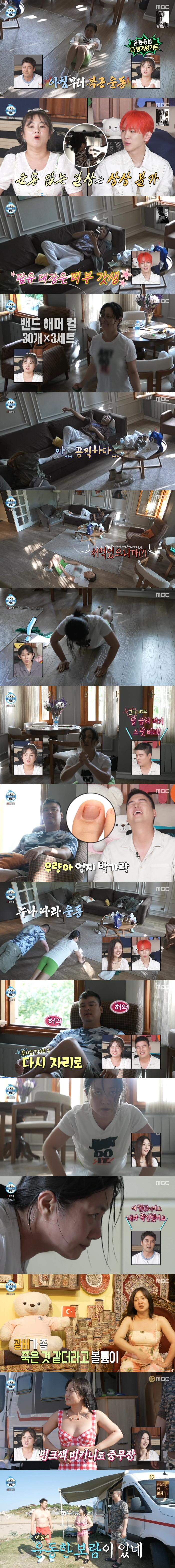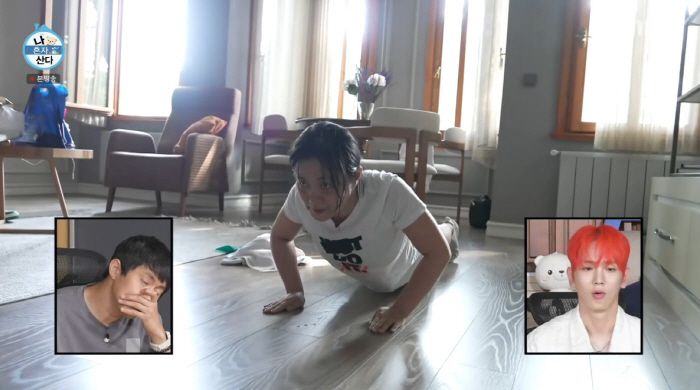 그때 퉁퉁 부은 얼굴로 이장우가 등장, 박나래는 팔 굽혀 펴기 스쾃 버피를 하는 등 계속해서 운동에 집중했다. 이에 이장우는 "누나 대단하다"면서 박나래 옆에서 푸시업을 시도했지만, 한 세트 후 "못 한다"며 포기 선언을 해 웃음을 자아냈다.