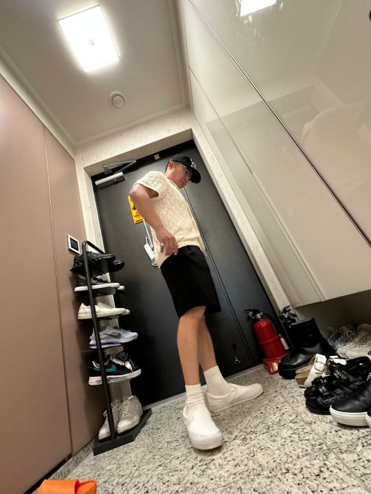 트레이닝복 차림에 야구 모자를 눌러쓴 채 찍힌 로우앵글 컷부터, 깔끔한 블랙 티셔츠와 데님 팬츠, 컬러풀한 운동화를 매치한 출근룩까지—현관이라는 좁은 프레임 안에서도 표정과 분위기는 바뀌었다.