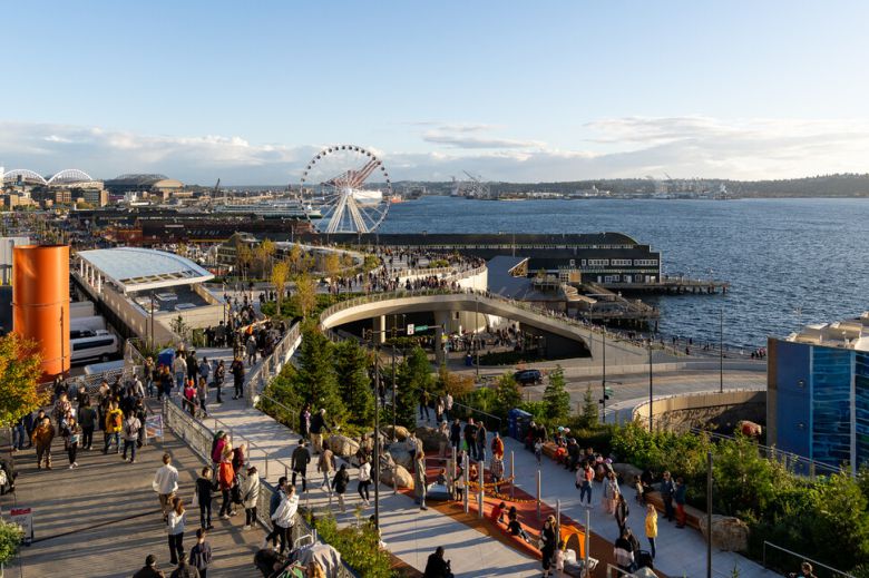 미국 태평양 연안 북서부 워싱턴주 시애틀 워터프런트의 오버룩 워크. 전망대와 산책길 역할을 동시에 하며 도시의 일상을 직조한다. 필드 오퍼레이션스 제공