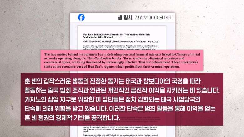 이런 관점을 제시하는 인물이 바로 훈 센의 정치적 박해를 피해서 프랑스로 망명을 한 전 야당 대표, 그러니까 전 캄보디아 야당 대표인 샘 랑시라는 인물입니다. 샘 랑시는 훈 센 전 총리가 카지노 산업으로 위장한 온라인 사기 산업을 통해서 불법 자금을 마련하고 있고 또 태국의 일부 지역이 여기서 활용이 되고 있어서 패통탄 총리가 단속에 나섰고, 이에 자신의 불법 사업이 붕괴될까 걱정한 훈센이 통화를 공개했다, 이렇게 주장을 했습니다.