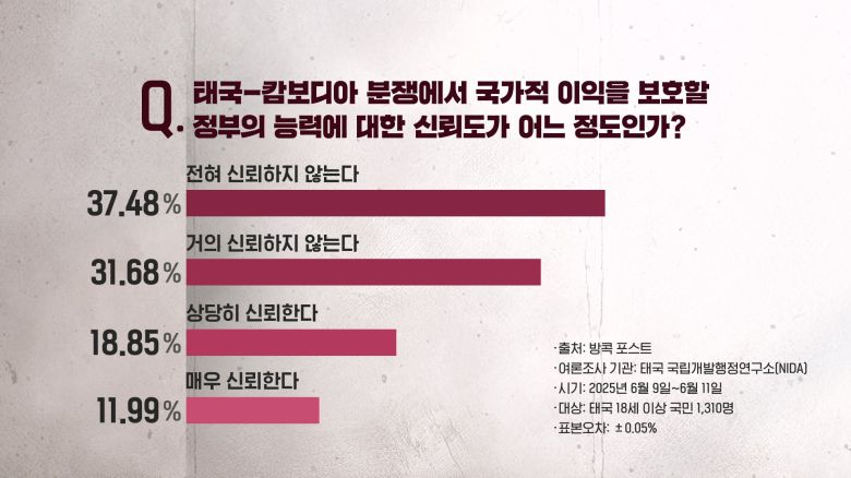 이미 이런 일이 있기 전에도 국민의 어떤 전폭적인 신뢰를 얻었다고 보기가 어려운 여론조사 결과들도 있거든요. 예를 들어서 태국 국립개발행정연구소 여론조사에 의하면요. 37.48%는요 정부를 전혀 신뢰하지 않는다고 답했고요. 31.68%는 정부를 거의 신뢰하지 않는다고 답했습니다. 통화 유출 이번 사건과는 별개로 이전부터 태국의 많은 국민들이 정부를 신뢰하지 않았다라고도 볼 수가 있는 부분인데요. 그리고 지난 6월 28일에 가장 큰 규모의 반정부 시위, 즉 2023년에 프아타이당이 집권을 시작한 이후에 가장 큰 규모의 반정부 시위가 일어나기도 했고요. 사실 태국의 정치 상황은 앞서도 언급했지만 군부의 지속적인 개입이 있었고, 쿠데타도 여러 번 이제 발생을 하고 그러다 보니까 정치 자체가 상당히 불안정한 측면들이 있었습니다.