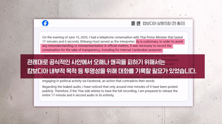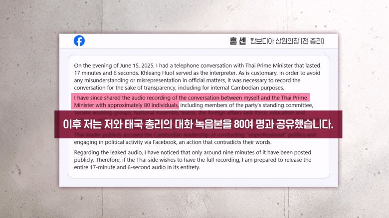캄보디아 측에서 유출을 한 걸로 보입니다. 훈 센 전 총리가 통화를 녹음을 하고 80여 명의 정부 관계자들에게 공유를 합니다. 이렇게 왜 공유를 했느냐, 이 부분에 대해서 본인은 이렇게 설명을 합니다. 이건 공적 통화였고 투명성을 위해서 기록이 필요했다, 그리고 이 내용을 혼자서 공유하기보다는 이제 공적인 대화니까 정부 관계자들하고 공유할 필요가 있었다라는 취지로 주장을 합니다. 초기에는 훈 센 전 총리가 9분 분량만, 이후에는 이제 17분 6초 그 전체 녹음본을 공개를 했거든요.