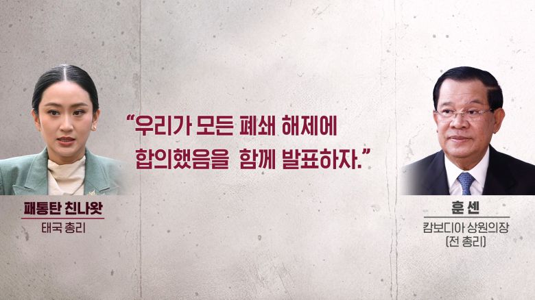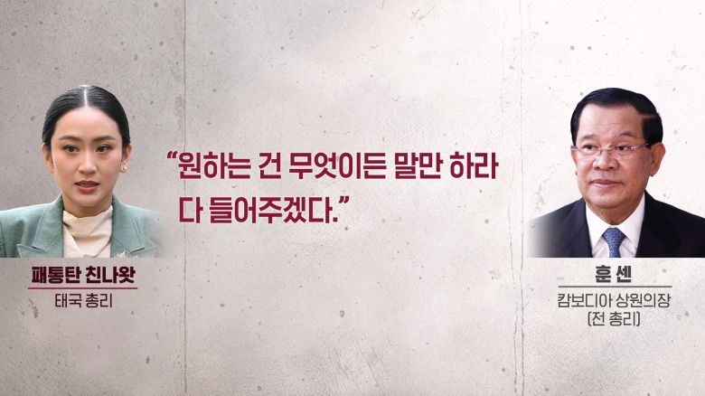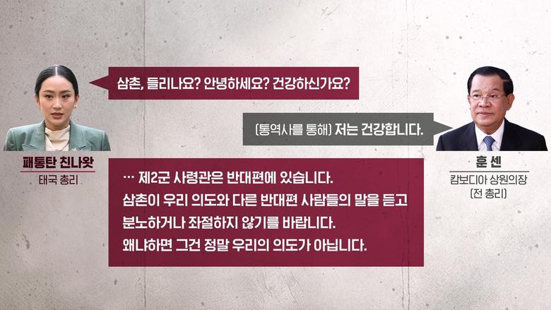 패통탄과 훈 센의 대화에서 훈 센이 강경하게 이런 말을 합니다. 태국 군이 자신들에게 병력 조정을 요구를 하니까 자신들은 그 요구에 응했고, 태국도 먼저 검문소를 열어야 캄보디아도 열 것이라고 이야기를 하거든요. 이에 대해서 패통탄이 완화 조치를 같이 발표를 하자고 설득을 합니다. 그 설득을 하는 과정에서 삼촌이 원하는 거 뭐든지 이야기해 달라, 뭐든지 이야기하면 자신이 들어주겠다라는 취지의 이야기도 합니다.