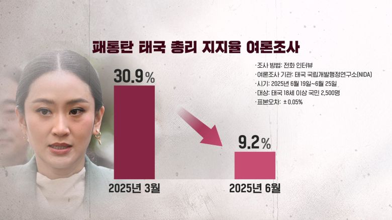 태국 국립 개발 행정연구원의 여론 조사를 보시면요. 패통탄 총리의 지지율도 30.9%에서 6월 9.2%로 뚝 떨어졌고요. 연립 정부 제2당인 품짜이타이당은요. 패통탄 총리가 국가의 정직성과 명예를 훼손했다면서 연정 탈퇴를 선언했습니다. 이 때문에 연립 정부의 과반 유지도 사실상 위태로운 상황입니다. 패통탄 총리는 이 와중에 본인을 문화부 장관으로, 말하자면 '셀프 임명'을 해서 야권의 비판을 받고 있는 상황입니다.