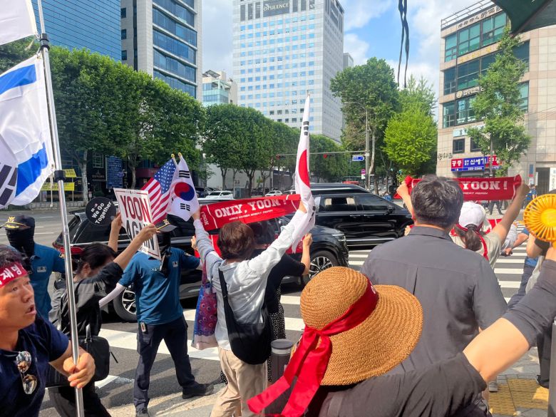 이와 동시에 맞은편에는 이재명 대통령 지지자 20여 명이 맞불 집회를 벌였다. 이들은 파란색 모자와 스카프를 착용한 채 ‘Yoon Prison’이라 적힌 손팻말을 들고 윤 전 대통령 측 지지자들과 고성을 주고받았다. 일부는 가벼운 몸싸움도 벌였다. 경찰은 양측을 분리하며 물리적 충돌을 차단했다.