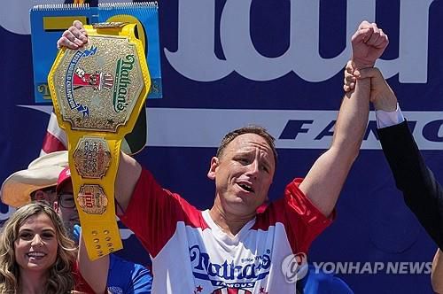 올해 미국에서 열린 '핫도그 많이 먹기' 국제 대회에서 유명한 '푸드 파이터' 조이 체스트넛(41)이 우승해 챔피언 벨트를 되찾았습니다.
