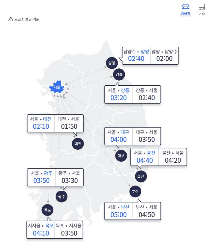 상행선은 △부산~서울 4시간50분 △대구~서울 3시간50분 △광주~서울 3시간30분 △대전~서울 1시간50분 △강릉~서울 2시간40분 △울산~서울 4시간20분 △목포~서서울 3시간50분이다.