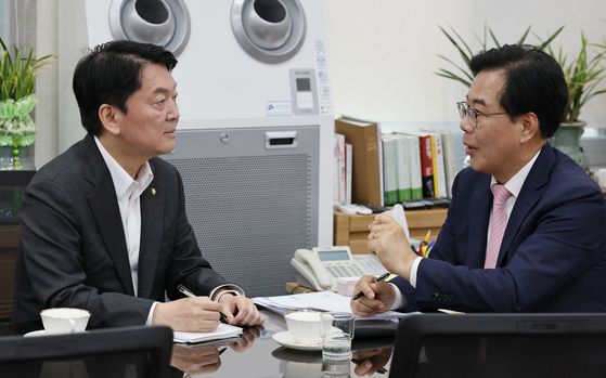 송언석 국민의힘 비상대책위원장 겸 원내대표(오른쪽)가 지난 2일 국회에서 혁신위원장으로 내정된 안철수 의원과 회동하고 있다. 임현동 기자.