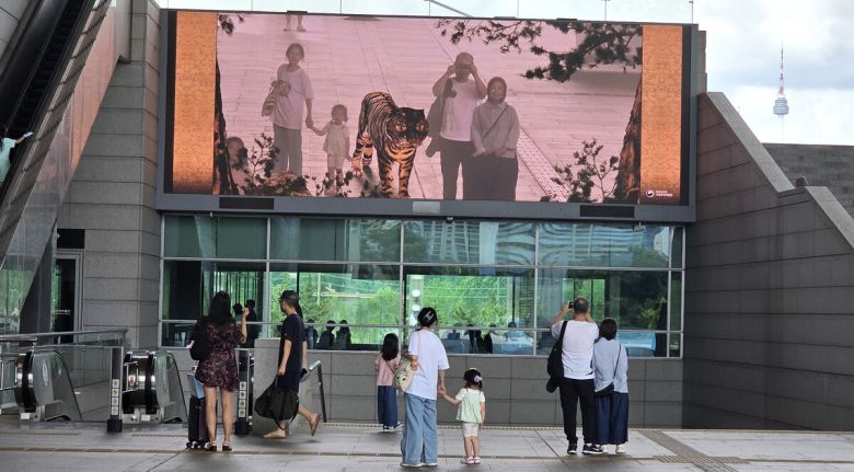 국립중앙박물관을 찾은 관람객들이 전통 회화 속 도상과 함께 자신의 모습을 비춘 대형 화면을 보고 있다. |