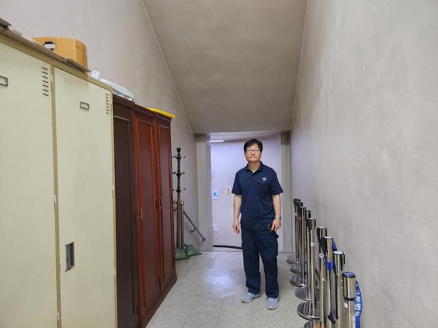 전문적이지 않은 직업이 있을까요? 평범하고도 특별한 우리 주변의 직장·일·노동. 그에 담긴 가치, 기쁨과 슬픔을 전합니다.1일 서울고등법원에서 만난 전기 공무직 노동자 서호양(60)씨가 지하 사무실로 내려가기 전 카메라를 바라보고 있다. 지하로 내려가는 통로 양옆에는 오래된 캐비과 옷 걸이 등이 놓여 있었다. 송주용 기자 |