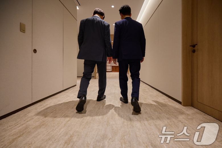 (서울=뉴스1) 허경 기자 = 이재명 대통령이 지난 4일 서울 용산 대통령실 청사에서 열린 김민석 신임 국무총리와 환담 뒤 이동하고 있다 (이재명 대통령 SNS. 재판매 및 DB 금지) 2025.7.5/뉴스1