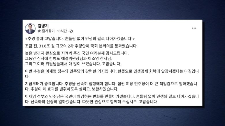 김병기 원내대표는 자신의 SNS에, 이번 추경은 이재명 정부와 민주당이 한뜻으로 민생경제 회복에 앞장서겠다는 다짐이라며 이같이 적었습니다.