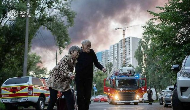 3∼4일 사이 러시아 공습 받은 키이우에서 두 노인이 길을 지나는 모습. [사진=젤렌스키 대통령 엑스(X·옛 트위터) 캡처]