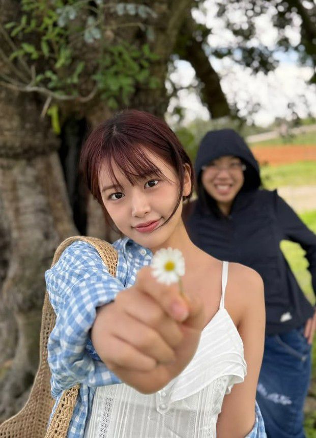 또 다른 사진에서는 화이트 슬리브리스 상의에 체크 셔츠를 어깨에 살짝 걸쳐 스타일링을 완성했다. 작은 꽃 한 송이를 쥐고 건네는 사랑스러움 뒤에 장난스러운 영지의 모습이 웃음을 자아낸다.