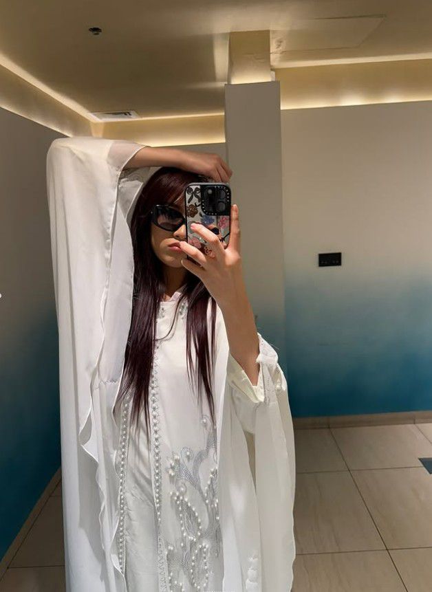 실내 거울 셀카에서도 안유진의 자신감 넘치는 포즈로 시선을 사로잡았다. 진주 장식이 더해진 화이트 의상을 착용하고, 블랙 빅프레임 선글라스로 시크한 포인트를 줬다. 또한 유니크한 실루엣과 소재감으로 독특한 분위기를 연출한 가운데 소매는 의상의 디테일을 돋보이게 만든다.
