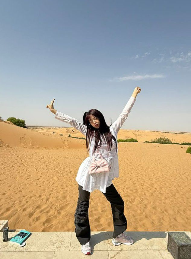 사막에서 찍은 사진에서는 롱한 기장의 화이트 상의에 크롭 화이트 카디건을 겹쳐 입고 주름 잡힌 블랙 카고 팬츠로 활동성과 스타일을 동시에 살렸다. 여기에 핑크 리본 장식 미니백으로 러블리한 무드를 더했다. 모래 배경에 대비되는 시원한 톤의 의상으로 돋보이는 스타일을 완성했다.