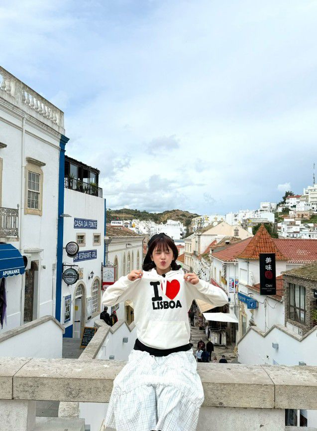 리스본에서는 'I♥︎LISBOA' 후디와 블랙 캡, 양갈래 트윈테일 스타일로 발랄한 분위기를 연출했다. 상반신은 키치한 분위기, 하의는 체크 롱스커트로 포르투갈의 감성과 잘 어울리는 캐주얼 스타일을 완성했다. 리스본의 동네가 한눈에 보이는 배경에 앉아 후디를 살짝 들어 올리며 밝은 표정을 지어 보인다.