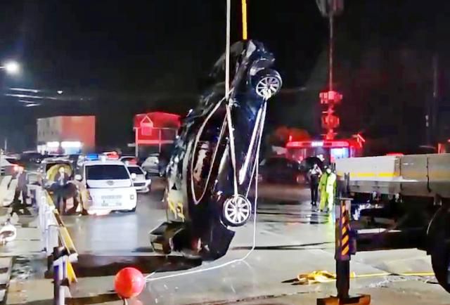 지난달 2일 전남 진도군 임회면 진도항에서 일가족이 탑승한 채 바다로 돌진한 차량이 인양되고 있다. 목포해양경찰서 제공 |