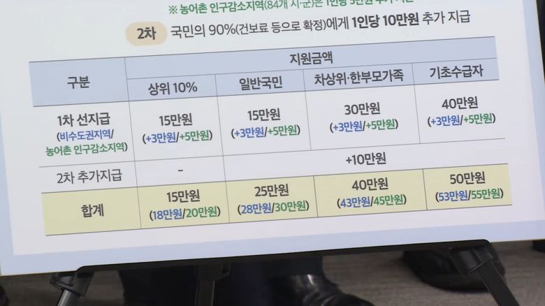 여기에 더해 비수도권 지역 주민에게는 3만 원, 소멸 위기를 겪는 농·어촌 인구감소지역 84개 시·군 주민에게는 5만 원이 추가로 주어집니다.