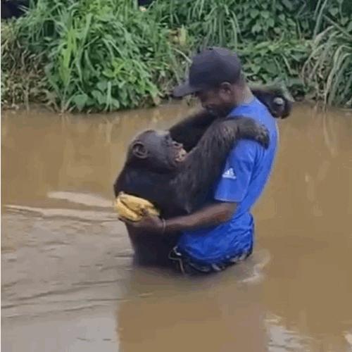 밀렵꾼에게 부모를 잃고 불법 거래에 팔려갔던 고아 침팬지가 자신을 구해준 남성과 재회해 포옹을 나누는 모습이 전해져 화제를 모으고 있다.