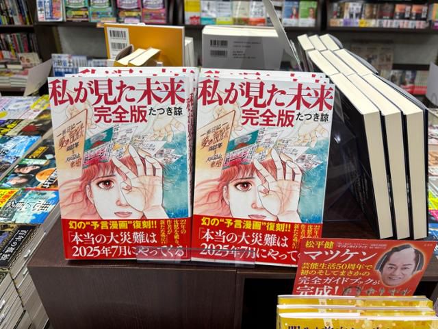 일본 도쿄 도내 한 서점이 지난달 28일 만화 '내가 본 미래 완전판'을 진열했다. 내가 본 미래에는 '7월 5일 오전 4시 18분 대규모 쓰나미(지진 해일)가 발생한다'는 내용이 담겨 화제가 됐다. 도쿄=류호 특파원 |
