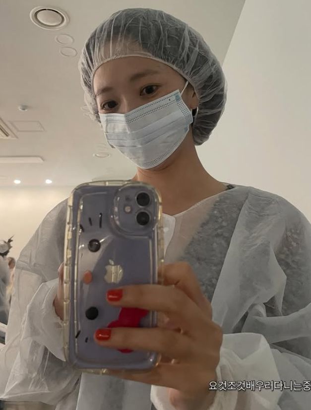 첫 번째 사진에서는 위생모와 가운을 착용한 채 거울 셀카를 찍고 있는 모습이 담겼다.