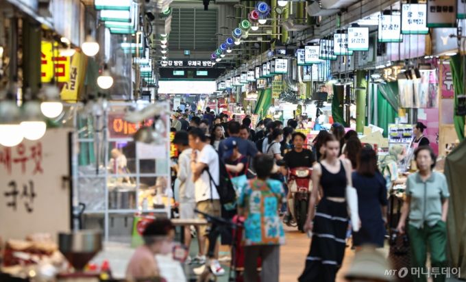 국회가 2차 추가경정예산안을 처리 예정인 4일 서울 마포구 망원시장에서 시민들이 장을 보고있다.  정부는 13조2000억원 규모의 '민생회복 소비쿠폰' 지원안과 6000억원 규모의 지역화폐(지역사랑상품권) 등이 포함된 추경안을 편성했다. 민생회복 소비쿠폰으로는 전 국민에게 1인당 15만~50만원을 차등 지급해 소비를 진작하고, 지역화폐로는 경제 활성화와 소상공인 지원에 나선다는 목표다. /사진제공=뉴스1