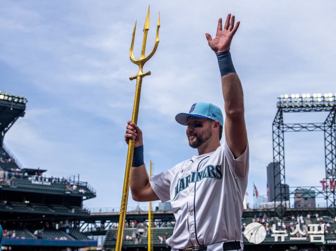 [시애틀 로이터=뉴스핌] 장환수 스포츠전문기자= 시애틀 칼 롤리가 5일 피츠버그와 홈경기가 끝난 뒤 팀 상징인 포세이돈 삼지창을 들고 나와 팬들의 환호에 답하고 있다. 2025.07.05 zangpabo@newspim.com |