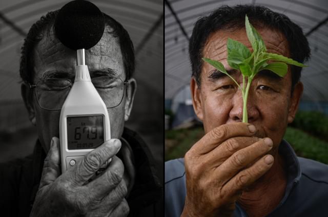 지난 2024년 11월 20일, 안효철 당산리 이장이 찡그린 얼굴로 소음 측정기를 손에 쥐고 있다(왼쪽 사진). 당시 북측이 쏟아내던 대남 소음 방송의 크기는 70데시벨(dB)을 넘나들었다. 이는 가까이 있는 청소기 소리에 버금가는 수준이다. 그로부터 7개월 뒤 안 이장이 다시 카메라 앞에 섰다. 그사이 대남 방송은 멎었고, 그의 손에는 소음계 대신 들깨 모종이 들렸다. 강화=하상윤 기자 |