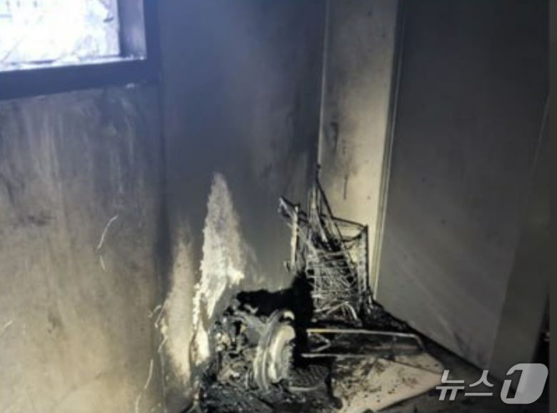 (화성=뉴스1) 김기현 기자 = 5일 오전 4시 35분쯤 경기 화성시 반월동 25층짜리 아파트 9층 세대 앞에 놓아둔 전동휠체어에서 불이 났다.