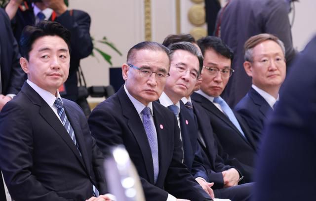 3일 청와대 영빈관에서 열린 이재명 대통령의 '대통령의 30일, 언론이 묻고 국민에게 답하다' 기자회견에서 대통령실 참모진이 이 대통령의 발언을 듣고 있다. 왼쪽부터 강훈식 비서실장, 위성락 국가안보실장, 김용범 정책실장. 뉴시스 |