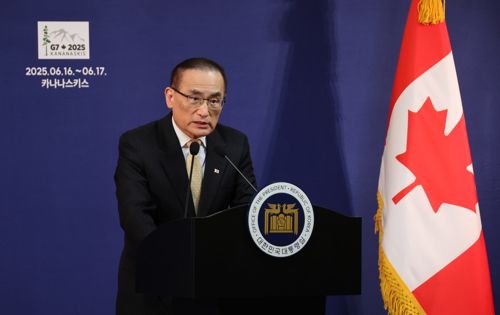 (캘거리=연합뉴스) 한상균 기자 = 위성락 대통령실 국가안보실장이 16일(현지시간) 캐나다 앨버타주 캘거리의 한 호텔의 한국 프레스센터에서 이재명 대통령의 주요 7개국(G7) 정상회의 관련 브리핑을 하고 있다. 2025.6.17