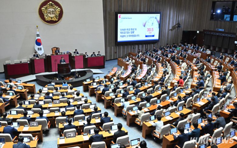 이재명 대통령이 서울 여의도 국회에서 2025년도 제2차 추가경정예산(추경)안 시정연설을 하고 있다. 유희태 기자