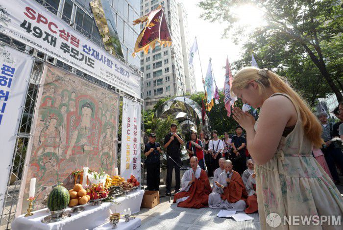 [서울=뉴스핌] 최지환 기자 = 대한불교조계종 사회노동위원회, 천주교서울교구 노동사목위원회, 한국기독교교회협의회 교회와 사회위원회, 파리바게뜨 노동자 힘내라 공동행동 회원들이 5일 오후 서울 서초구 SPC 본사 앞에서 SPC삼립 산재사망사고 49재 추도식을 열고 있다. 2025.07.05 choipix16@newspim.com