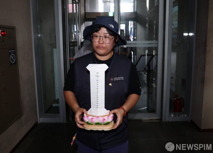 [서울=뉴스핌] 최지환 기자 = 임종린 민주노총 화섬식품노조 파리바게뜨지회장이 5일 오후 서울 서초구 SPC 본사 앞에서 열린 SPC삼립 산재사망사고 49재 추도식에서 사망 노동자의 위패를 들고 본사로 진입하고 있다. 2025.07.05 choipix16@newspim.com |