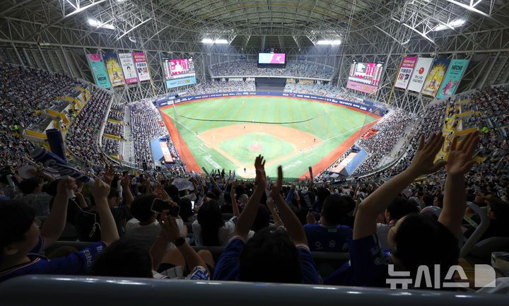 [서울=뉴시스] 전신 기자 = 2024 프로야구가 900만 관중을 돌파한 28일 서울 구로구 고척스카이돔에서 열린 2024 KBO리그 삼성 라이온즈와 키움 히어로즈 경기에서 관중들이 열띤 응원을 하고 있다. 2024.08.28. photo1006@newsis.com |