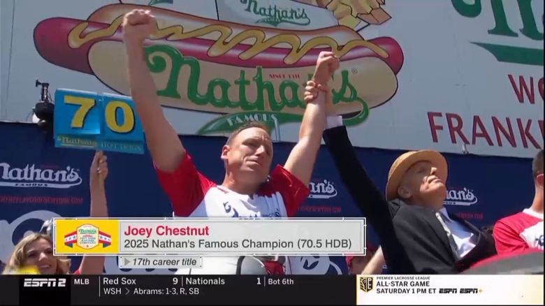 체스트넛은 미국 독립기념일인 현지시간 4일, 네이선스 국제 핫도그 먹기대회에서 10분간 무려 핫도그 70.5개를 집어삼키며 우승했습니다.