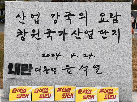 지난해 12월 10일 경남 창원시 성산구 한국산업단지공단 경남지역본부 앞에 설치된 윤석열 대통령 표지석에 민주노총 경남본부가 검은색 스프레이로 '내란' 글자를 칠했다. 사진은 당시 표지석 모습 [사진=연합뉴스(민주노총 경남본부 제공)] |