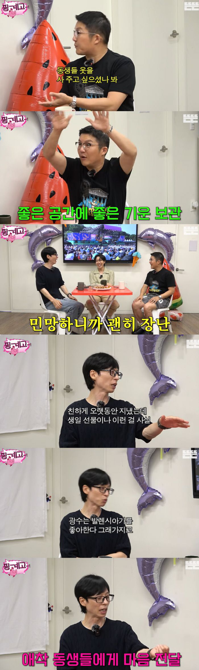 이에대해 유재석은 "친하게 오랫동안 지냈는데 생일 선물이나 이런 걸 쑥스러우니까 잘 안 하지 않냐. 그래서 한번 그때 광수랑 조셉이랑 창희랑"이라며 조세호뿐만 아니라 이광수와 남창희 등 아끼는 동생들에게 명품을 선물했음을 밝혔다. 조세호가 "광수 거는 발렌시아가"라고 덧붙였다.