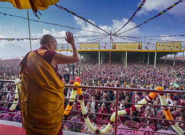 '티베트의 정신적 지도자' 달라이 라마가 중국의 반대에도 2017년 4월 9일 인도 아루나찰프라데시 타왕에서 법회를 열고 5만 명이 넘는 군중들에게 손을 흔들고 있다. 달라이 라마 공식사무국(OHHDL) 제공