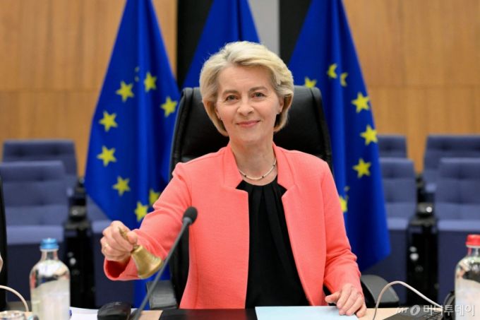 우르줄라 폰데어라이엔 유럽연합(EU) 집행위원장이 지난달 4일 벨기에 브뤼셀 소재 EU 본부에서 열린 집행위원회 회의를 시작하며 벨을 울리고 있다. /사진=브뤼셀 AFP=뉴스1