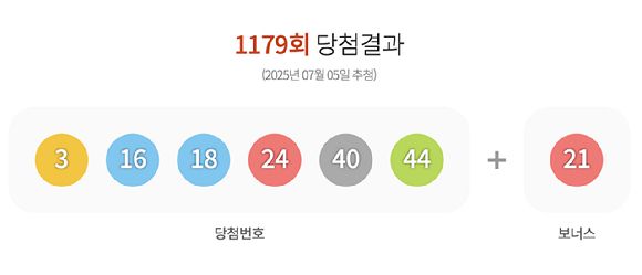 [아이뉴스24 김효진 기자] 로또복권 운영사 동행복권은 제1179회 로또복권 추첨 결과 '3, 16, 18, 24, 40, 44'가 1등 당첨번호로 뽑혔다고 5일 밝혔다. 2등 보너스 번호는 '21'이다.