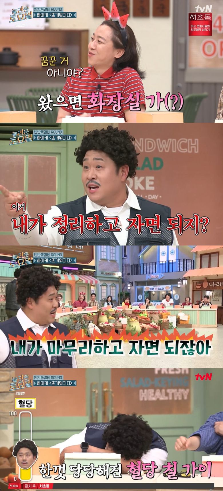차가운 멤버들의 반응에 문세윤은 "이거 내가 정리하고 자면 되지? 내가 마무리하고 자면 되잖아"라며 자신감에 가득 찬 멘트를 건넸고, 이어 엎드려서 자는 퍼포먼스까지 선보여 폭소를 자아냈다.