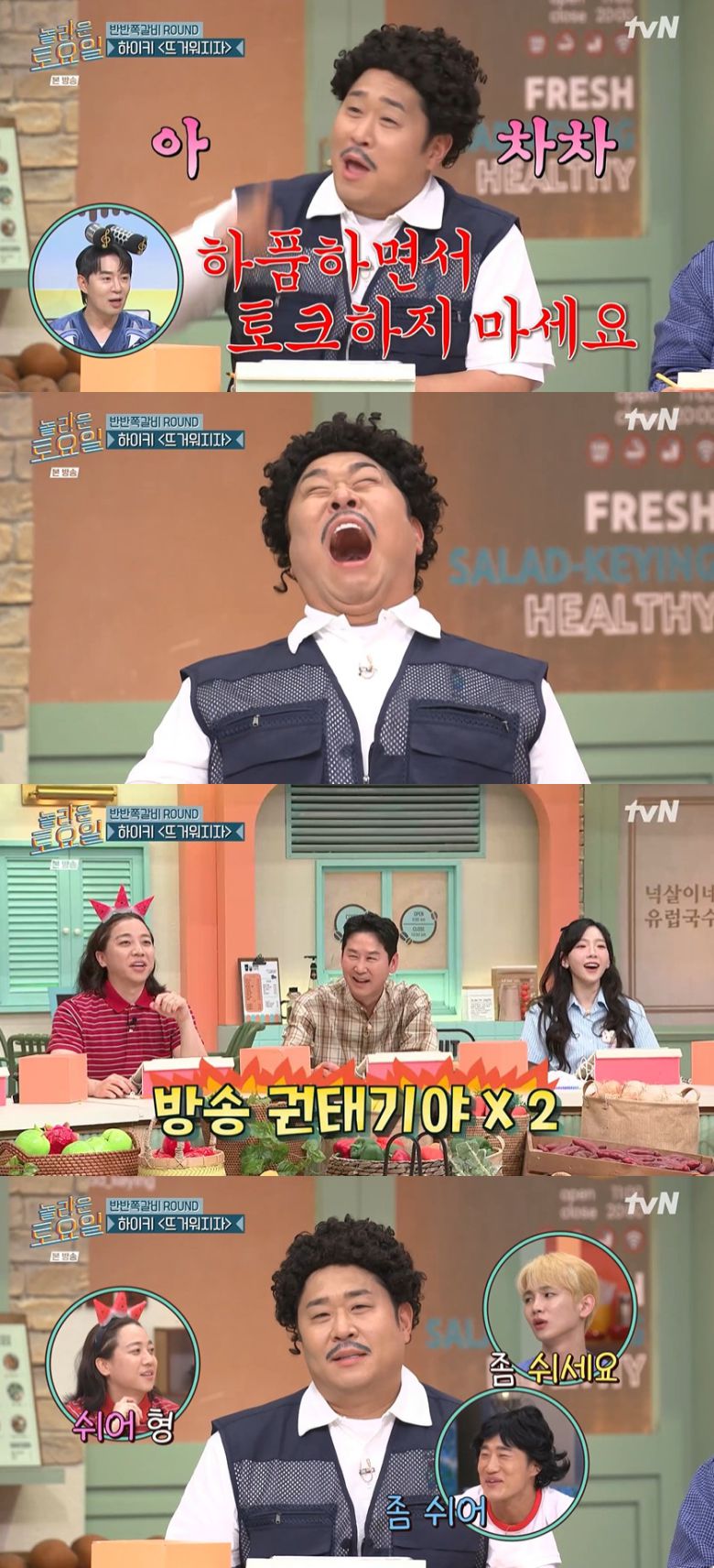 또 넉살은 "방송 권태기"라는 의혹을 제기하기도. 어어 키와 김동현도 "좀 쉬세요"라며 거들었고, 결국 문세윤은 "잤다 잤어"라며 앞서 먹은 음식들에 방송 중 혈당이 올라 피로감을 느꼈음을 인정했다.