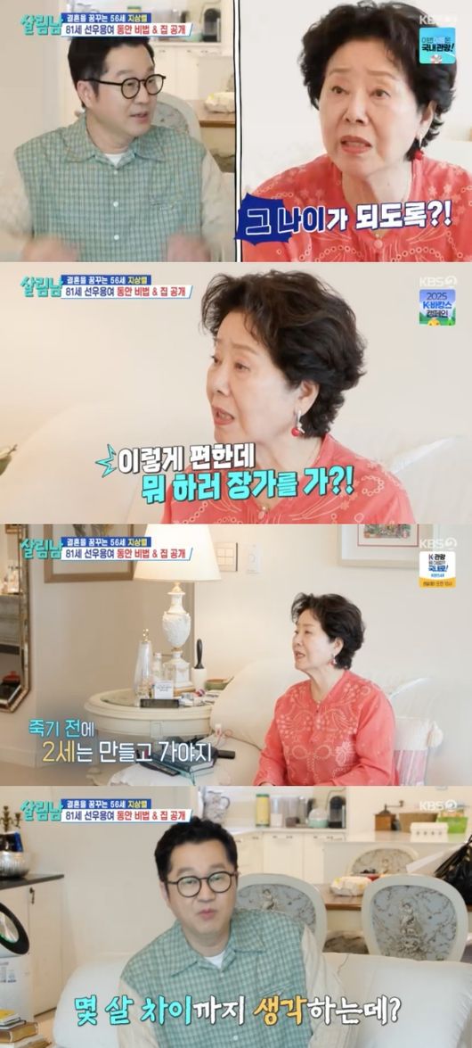 선우용여는 “일주일에 다섯 번 헬스장을 간다”라며 자신만의 관리 비법을 밝혔다. 선우용여는 아직도 결혼하지 못한 지상렬에게 “분가를 해야 한다. 그 나이 되도록 돈을 안 벌어놨냐. 네 집으로 들어가야 한다. 형수가 다 해주는데 뭐 하러 장가를 가냐. 2세는 하나 만들어 놓고 가야 하지 않겠냐”라고 직언했다.