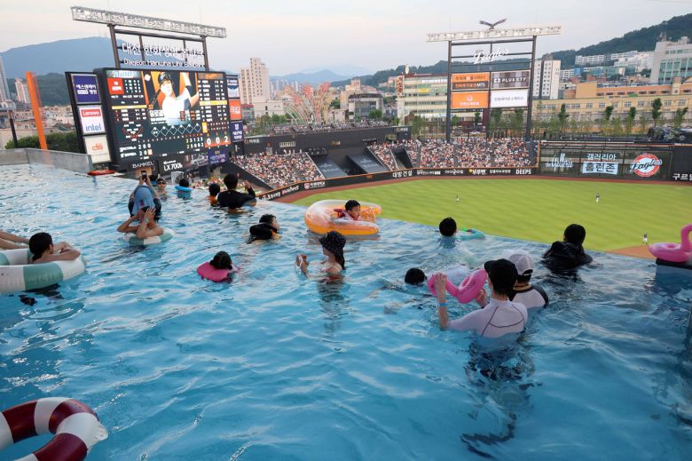 [헤럴드경제=민성기 기자] 세계 최초로 수영하며 야구를 볼 수 있도록 설계한 한화 이글스의 새 홈구장 대전 한화생명볼파크의 ‘인피니티풀’이 시범 운영에 들어간 가운데 “야구를 보다 수영장 물을 맞았다”는 관중의 불만이 이어졌다.