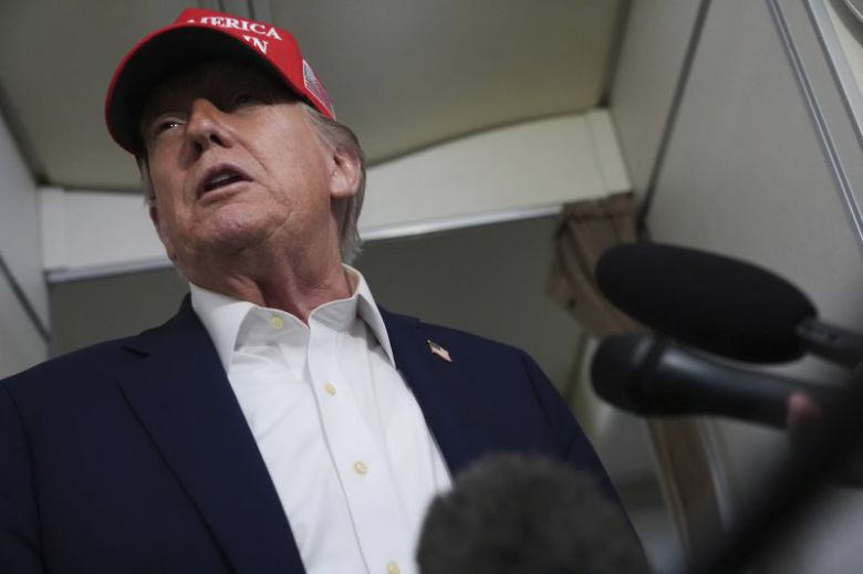 도널드 트럼프 미국 대통령이 4일(현지시간) 뉴저지주 모리스타운으로 가기 위해 탑승한 에어포스 원에서 기자들의 질문에 답하고 있다. AP 뉴시스 |