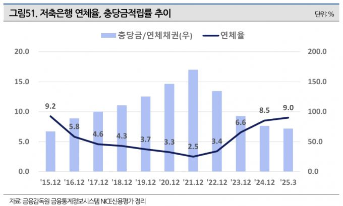 특히, 신평 3사가 본 저축은행의 연체율은 2021년 말 2.5%에서 2022년 말 3.4%, 2023년 말 6.6%, 2024년 말 8.5%, 2025년 3월 말 9.0% 등으로 악화되고 있다. 저축은행의 연체율이 상승하면서 연체채권 대비 충당금적립률은 100% 미만으로 하락한 상태다. 올해 1분기 79개 저축은행의 손실 폭은 줄었지만 이익이 난 곳도 아직 많지 않은 상황이다.