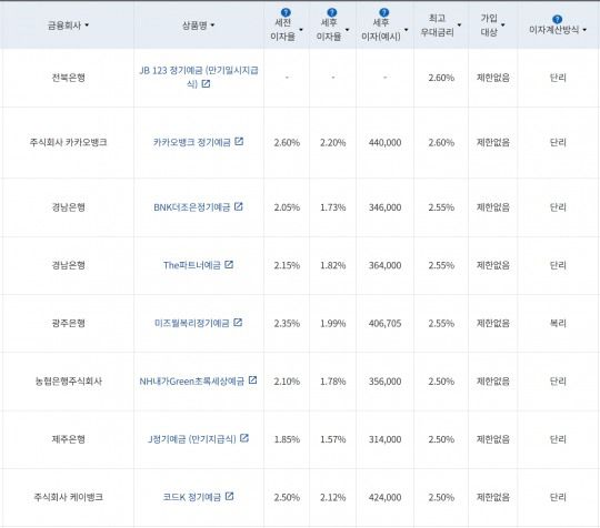 6일 금융감독원 금융상품통합비교공시에 따르면 은행 24개월 정기예금 상품 중 최고 우대금리를 제공하는 상품은 전북은행의 ‘JB 123 정기예금(만기일시지급식)’으로, 최고 2.60%의 금리를 제공한다. 우대 조건은 자동재예치 우대이율에 따라 달라지며 ▲1회차 0.1%p ▲2회차 0.2%p ▲3회차 0.3%p 등이다.