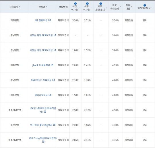6일 금융감독원 금융상품통합비교공시에 따르면 제주은행 ‘MZ플랜적금’이 최고 우대금리 5.20%를 제공해 가장 높은 금리를 기록했다. 이 상품의 세전이자율은 3.20%다. 우대조건은 ▲매월 1회 이상 지속적 납입 시 1년제 0.50%p ▲목표 금액 달성 시 0.50%p ▲신용카드·체크카드 합산 사용액 월 10만원 이상 사용 시 0.50%p ▲‘청년이니까 응원합니다’ 이벤트 참여 시 0.50%p 등의 우대금리를 제공한다. 월 납입한도는 30만원 이하다.
